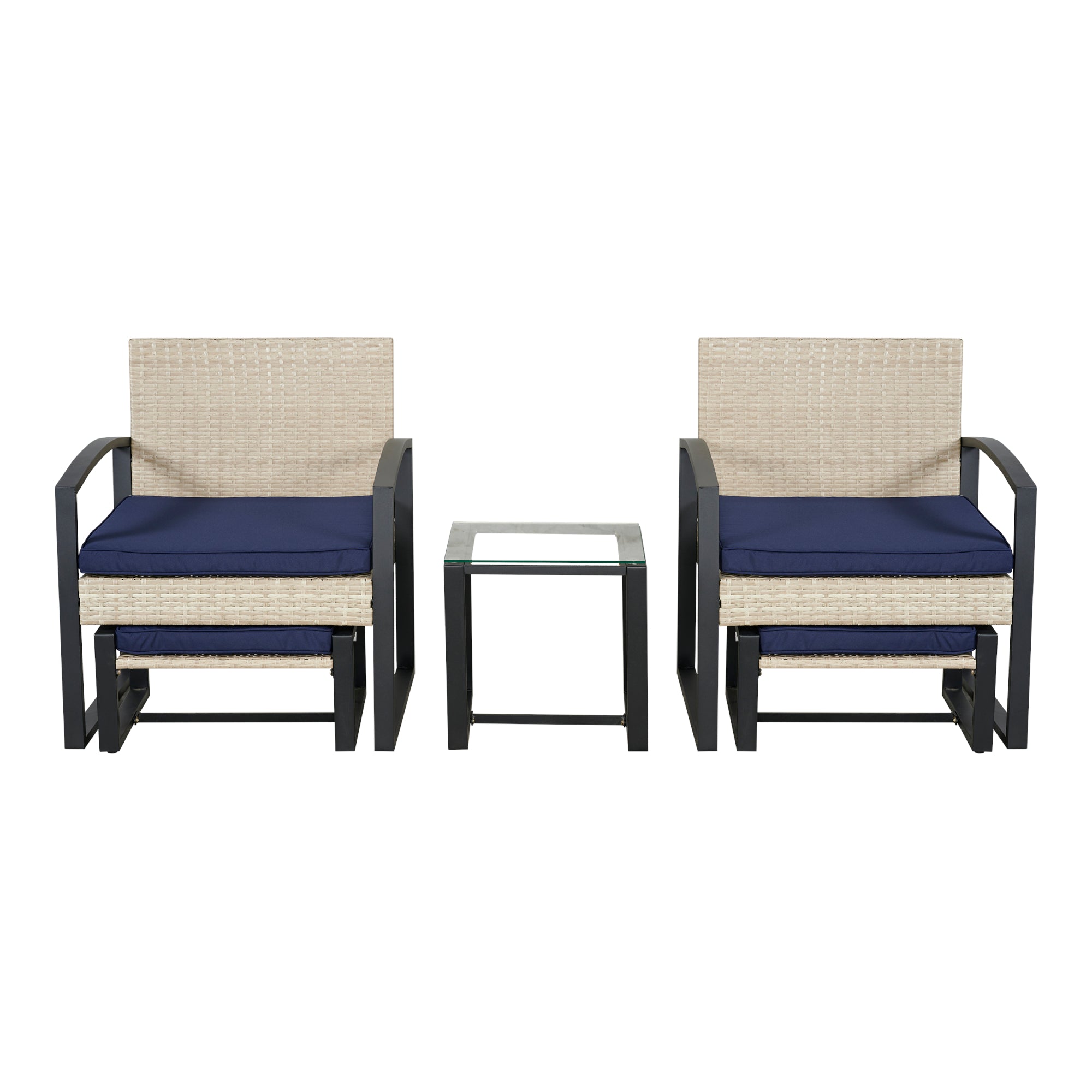 Les chaises de l'ensemble se distinguent par leurs accoudoirs confortables et leurs coussins d'assise moelleux, garantissant un grand confort d'assise. L'ensemble est complété par les deux repose-pieds assortis et la table en verre élégante.