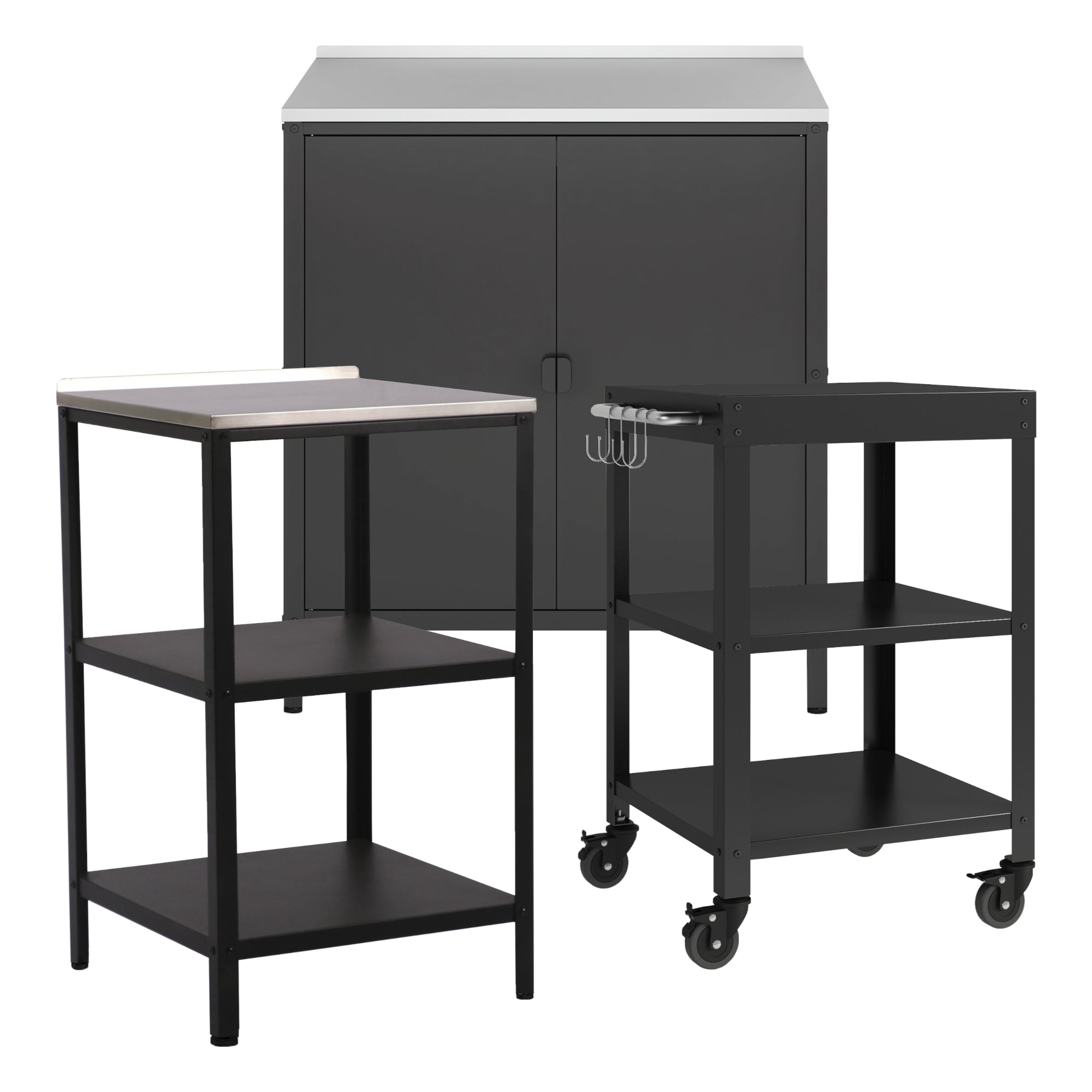L'ensemble de mobilier de jardin en trois parties est le complément parfait pour votre jardin, votre terrasse ou votre balcon. Il se compose d'une armoire, d'une étagère ainsi que d'un chariot de service et offre suffisamment d'espace de rangement pour tous vos objets. Les trois meubles sont spécialement conçus pour une utilisation en extérieur et sont fabriqués en matériau résistant aux intempéries. L'étagère de jardin élégante et pratique est équipée de trois niveaux de rangement au total. L'armoire de jardin assortie dispose de deux portes et d'une étagère supplémentaire à l'intérieur. Le chariot de service complète idéalement cet ensemble grâce à sa mobilité flexible sur quatre roulettes. Il facilite le service et apporte plus de confort lors de la réception des invités.