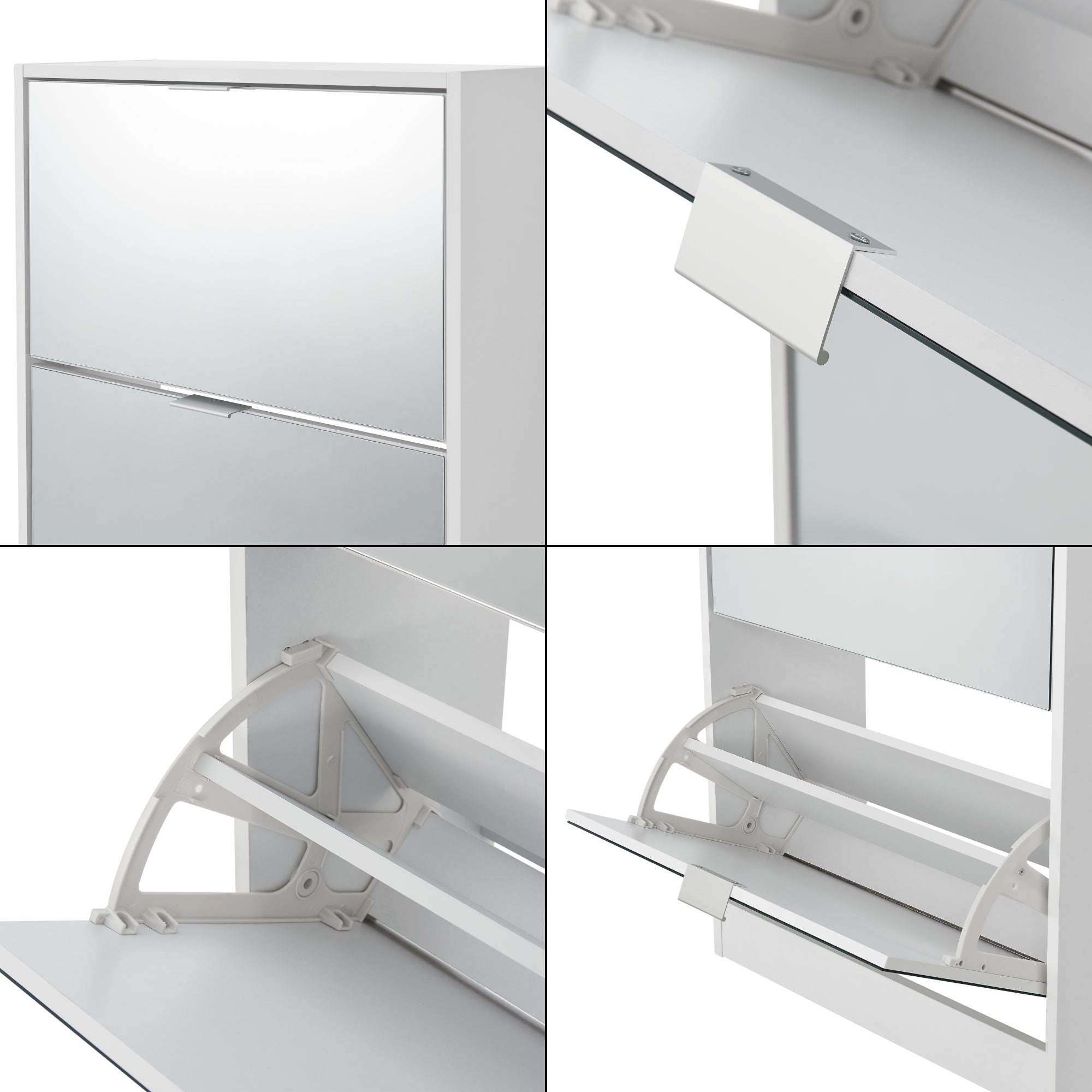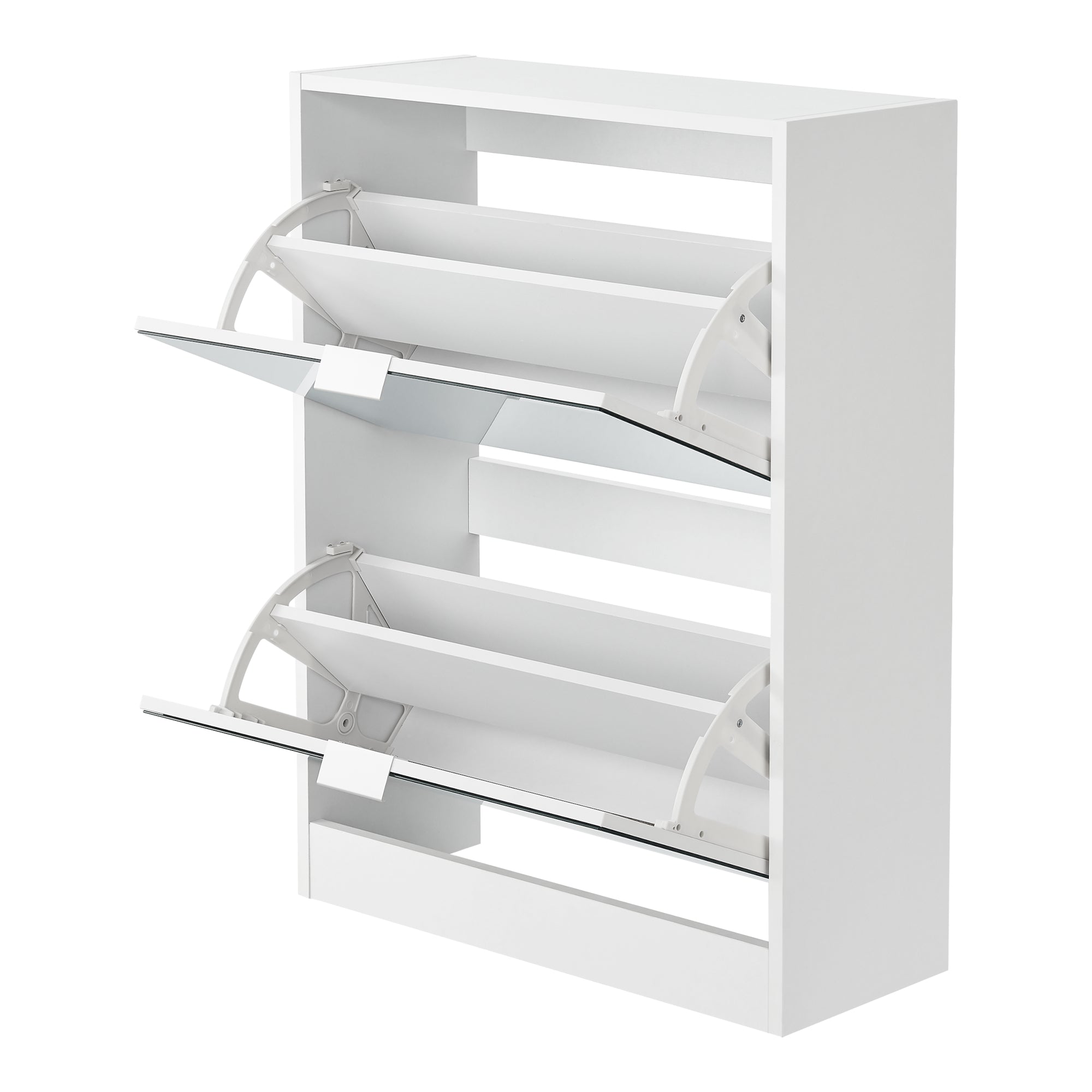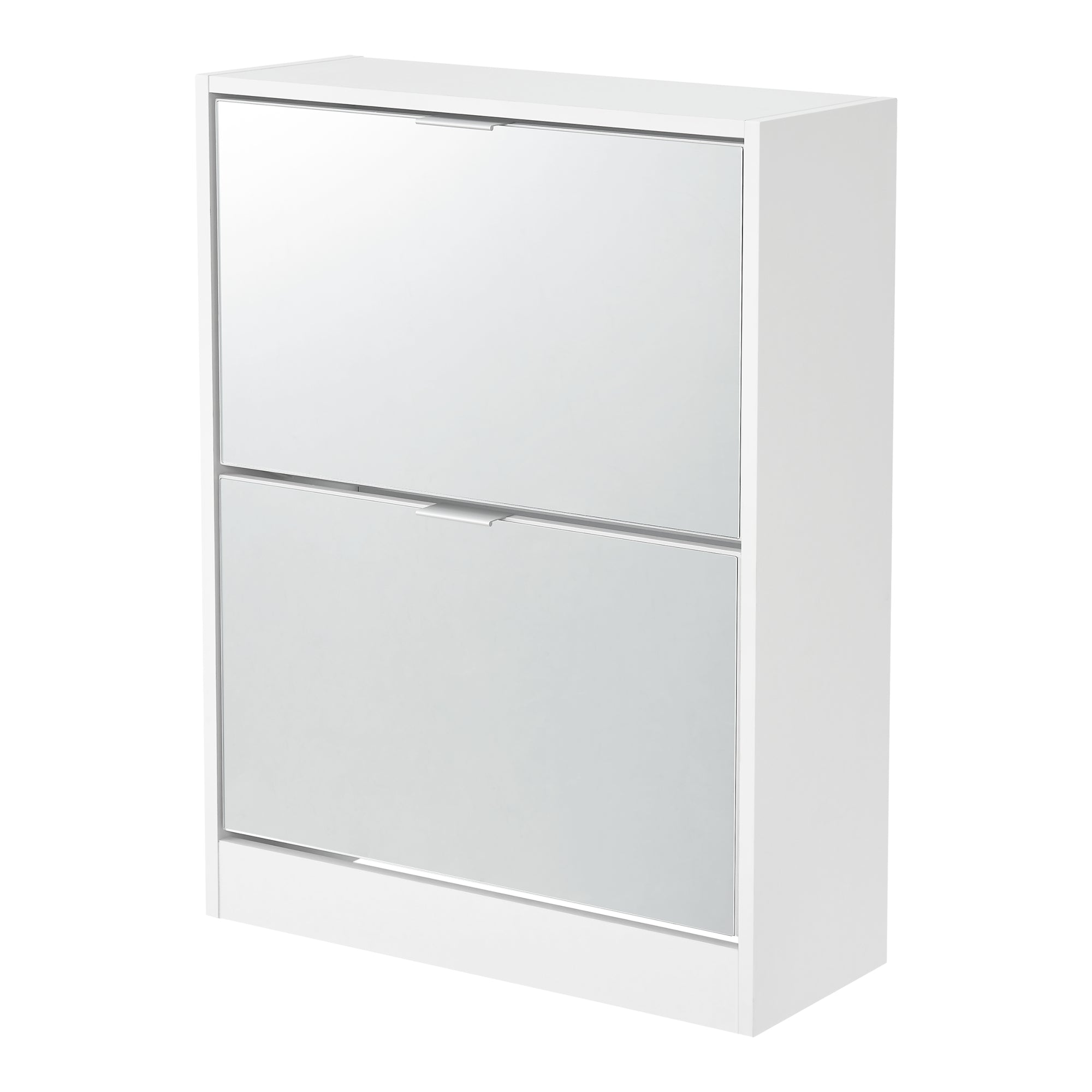 L'armoire à chaussures dispose de deux portes basculantes avec une façade miroir. Cette surface réfléchissante confère une touche de raffinement au meuble et agrandit visuellement l’espace. En même temps, elle vous permet un dernier regard sur votre tenue pendant que vous choisissez vos chaussures.