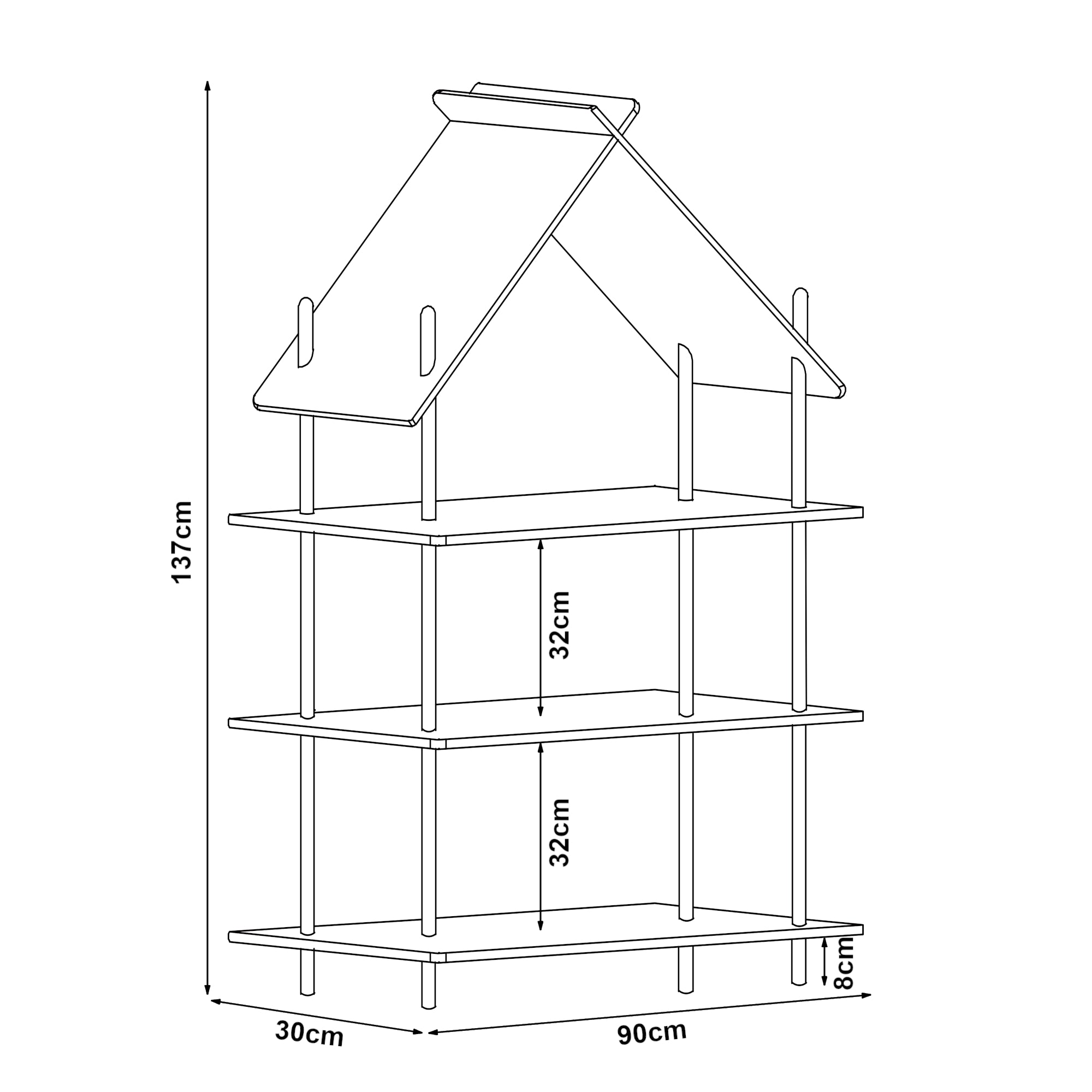 - Distance entre les étagères : 32 cm chacune
