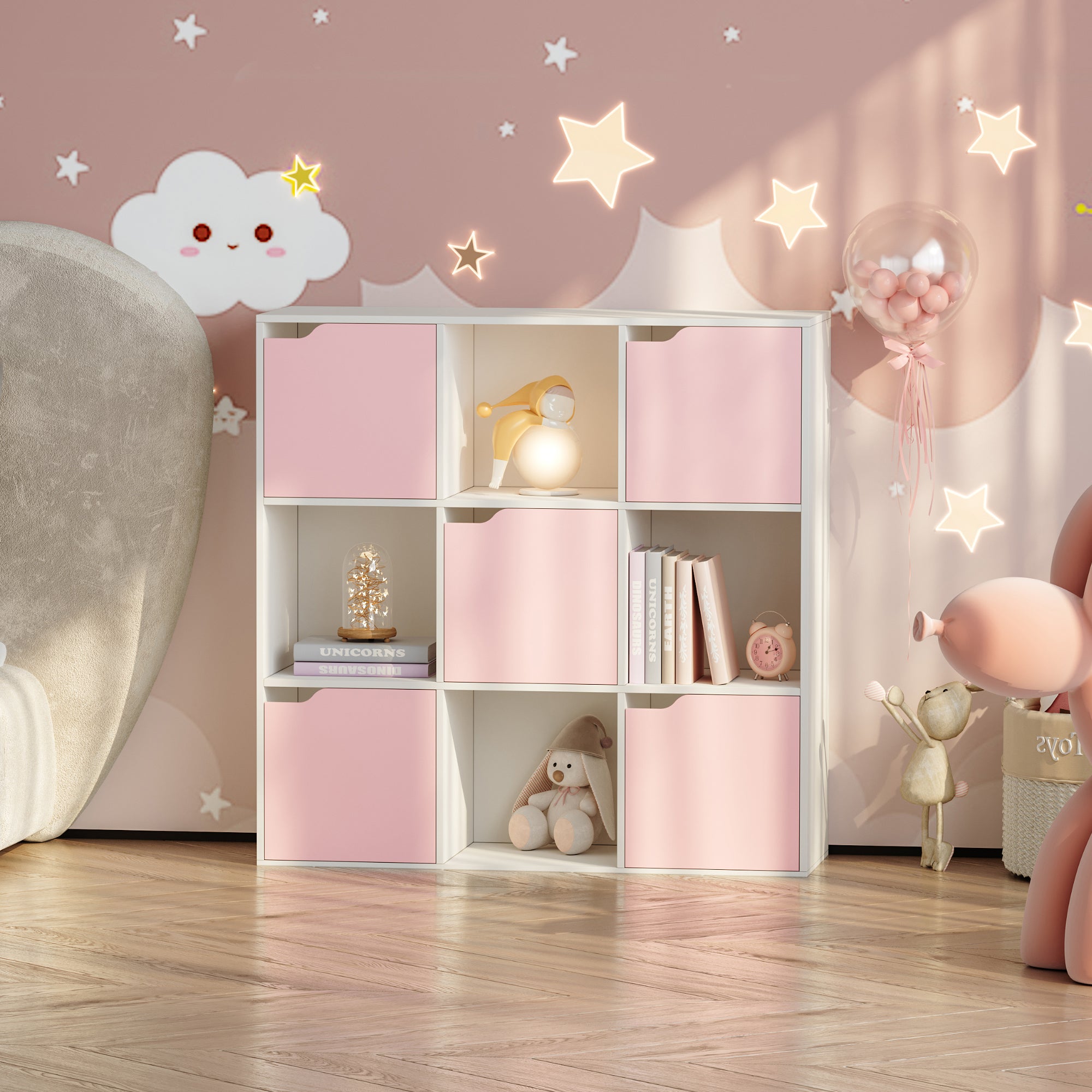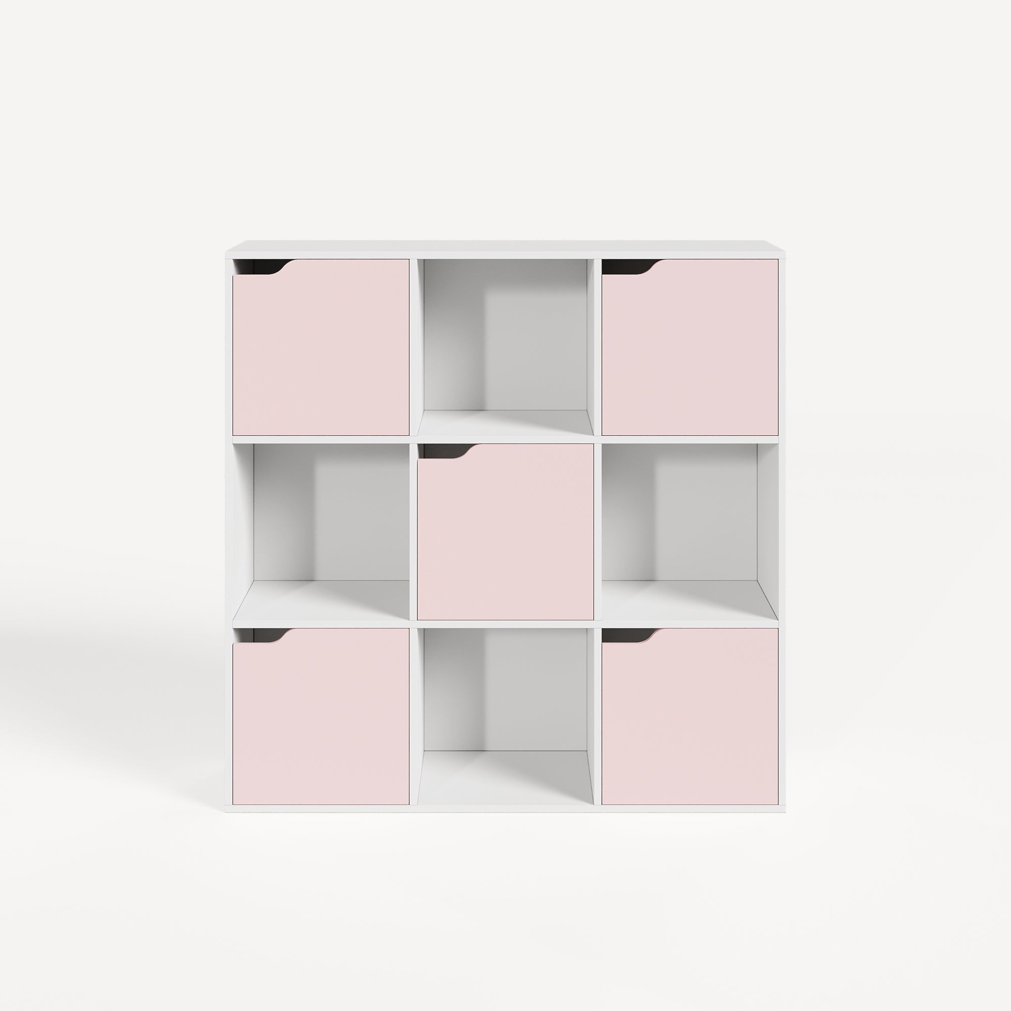 Avec ses neuf compartiments de taille égale, cette étagère de rangement propose un vaste espace pour divers objets. Cinq compartiments sont équipés de portes avec une poignée encastrée pratique, tandis que quatre espaces ouverts laissent place à des éléments décoratifs.