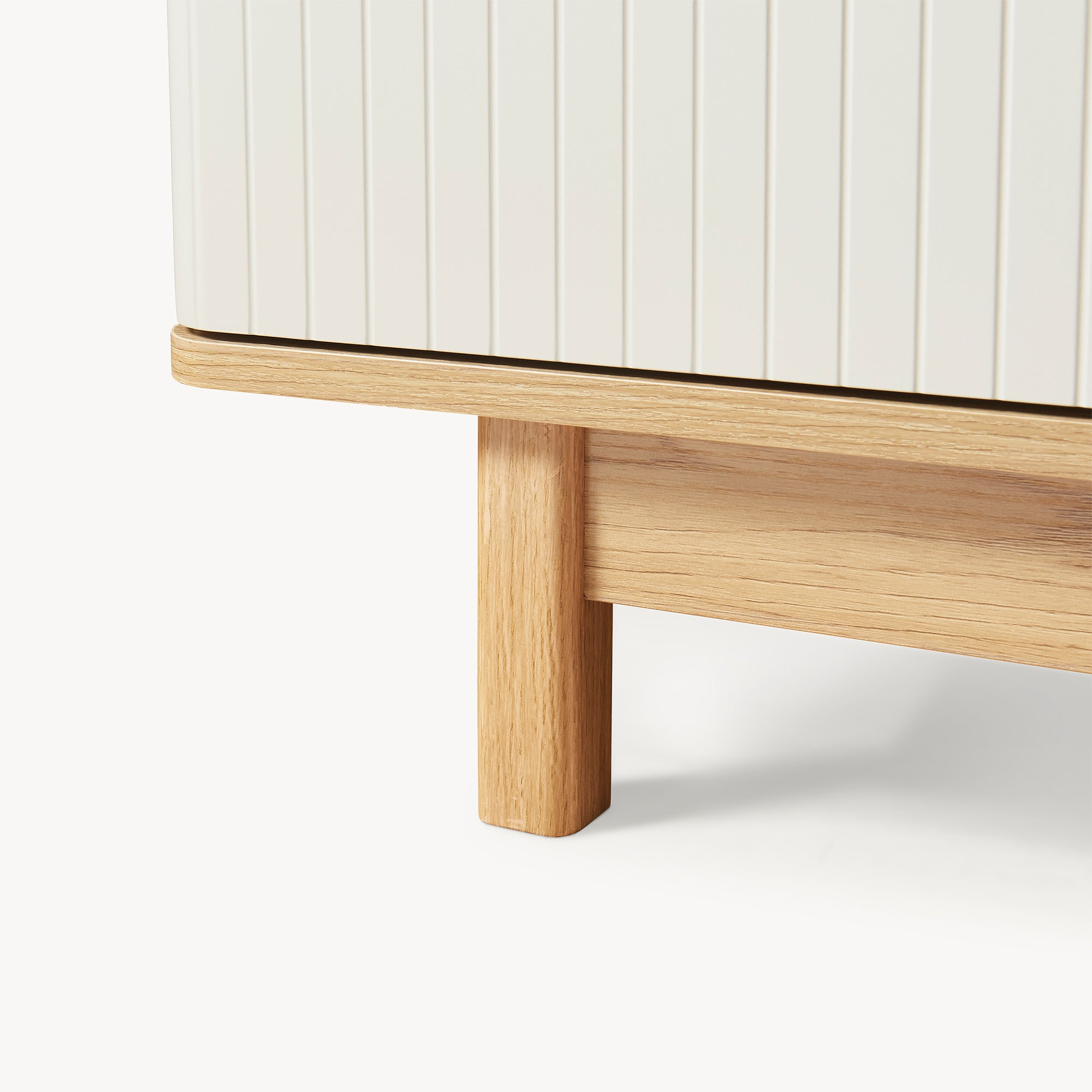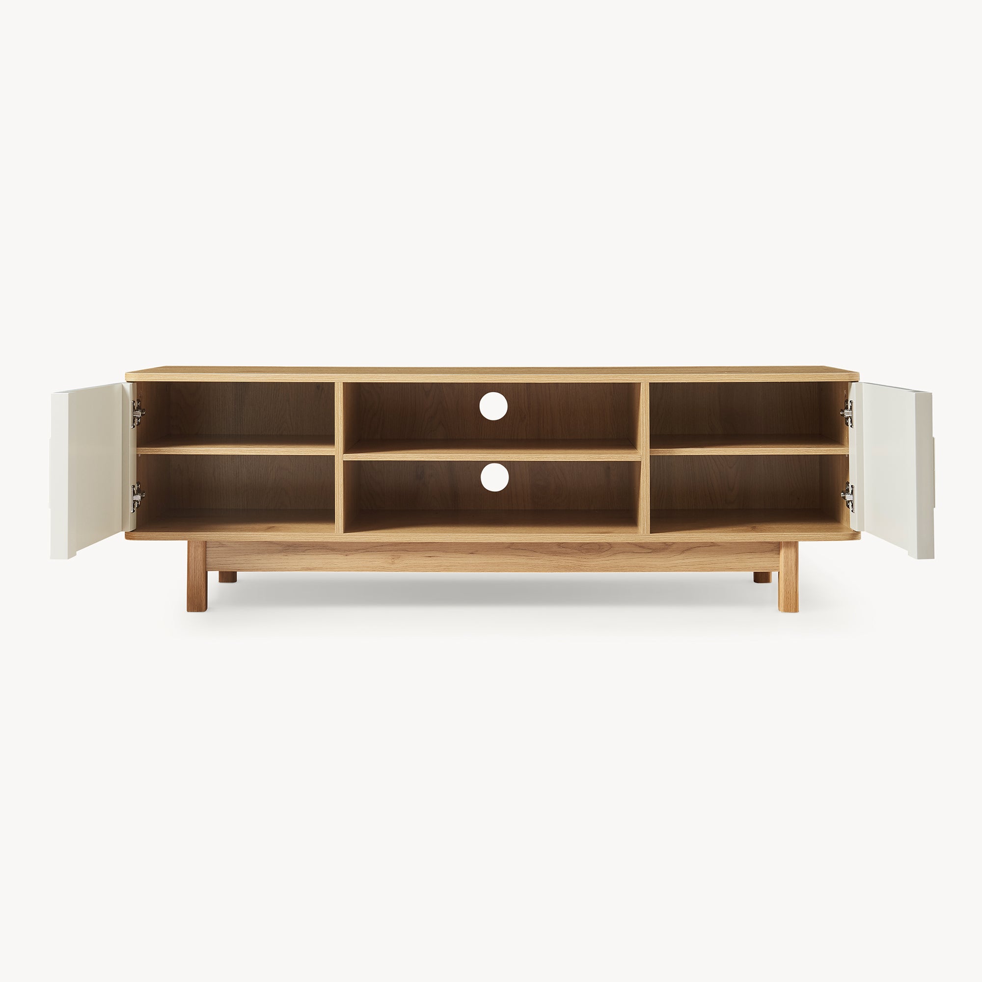 La surface généreuse du meuble bas offre suffisamment d’espace pour votre téléviseur. En dessous se trouvent deux compartiments ouverts, idéaux pour ranger des appareils multimédias tels que lecteurs DVD ou consoles de jeux. Des passages de câbles intégrés à l’arrière assurent une gestion ordonnée des câbles ainsi qu’un aspect soigné, tout en gardant tous les appareils et accessoires importants à portée de main.