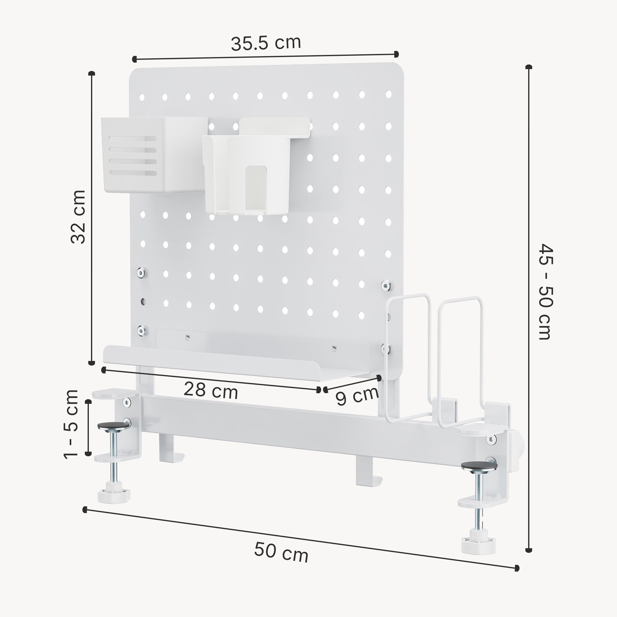 Le montage par pince stable assure une fixation sûre sans perçage et convient aux plateaux de table d’une épaisseur de 1 à 5 cm. Vous créez ainsi un espace de rangement supplémentaire sans réduire la surface de travail ni modifier durablement la table.