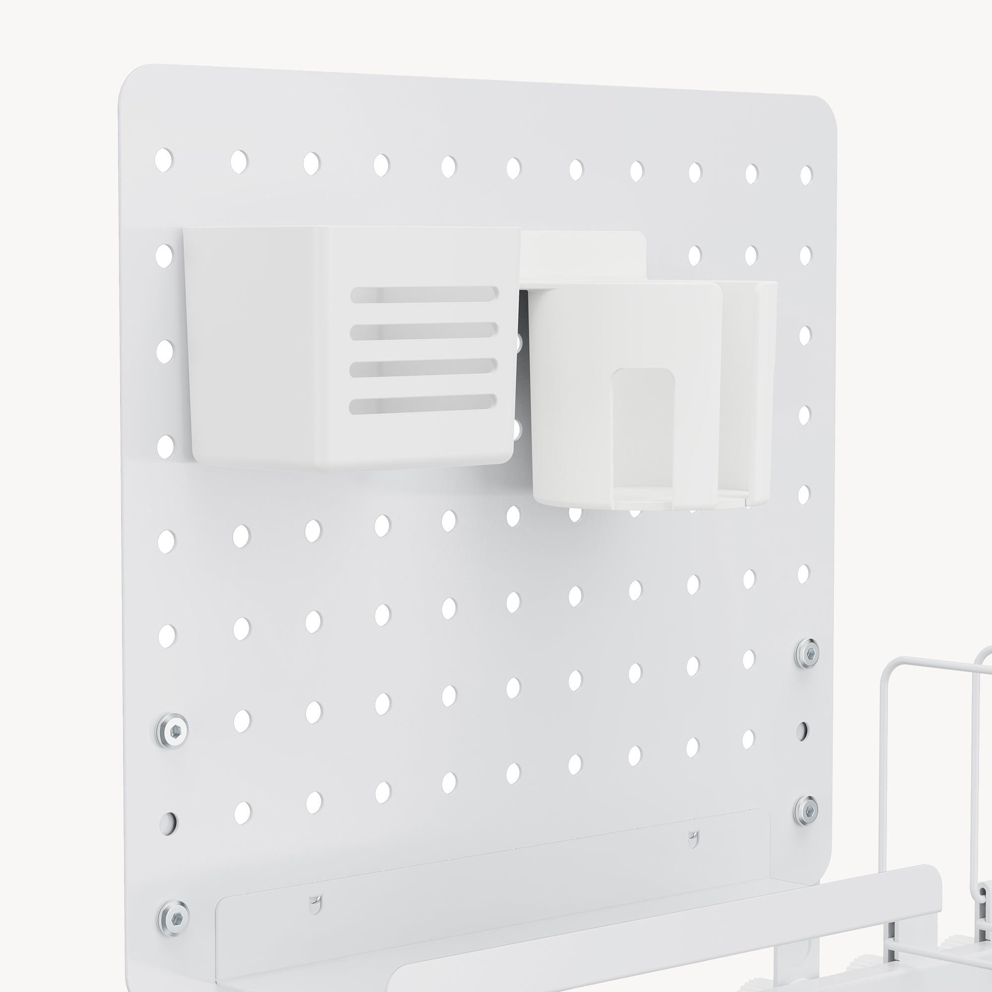 Le panneau perforé offre de nombreuses possibilités d’organisation individuelle. Le porte-stylos fourni ainsi que le porte-gobelet et la tablette avec rebord surélevé peuvent être placés librement – exactement là où vous en avez besoin au quotidien.