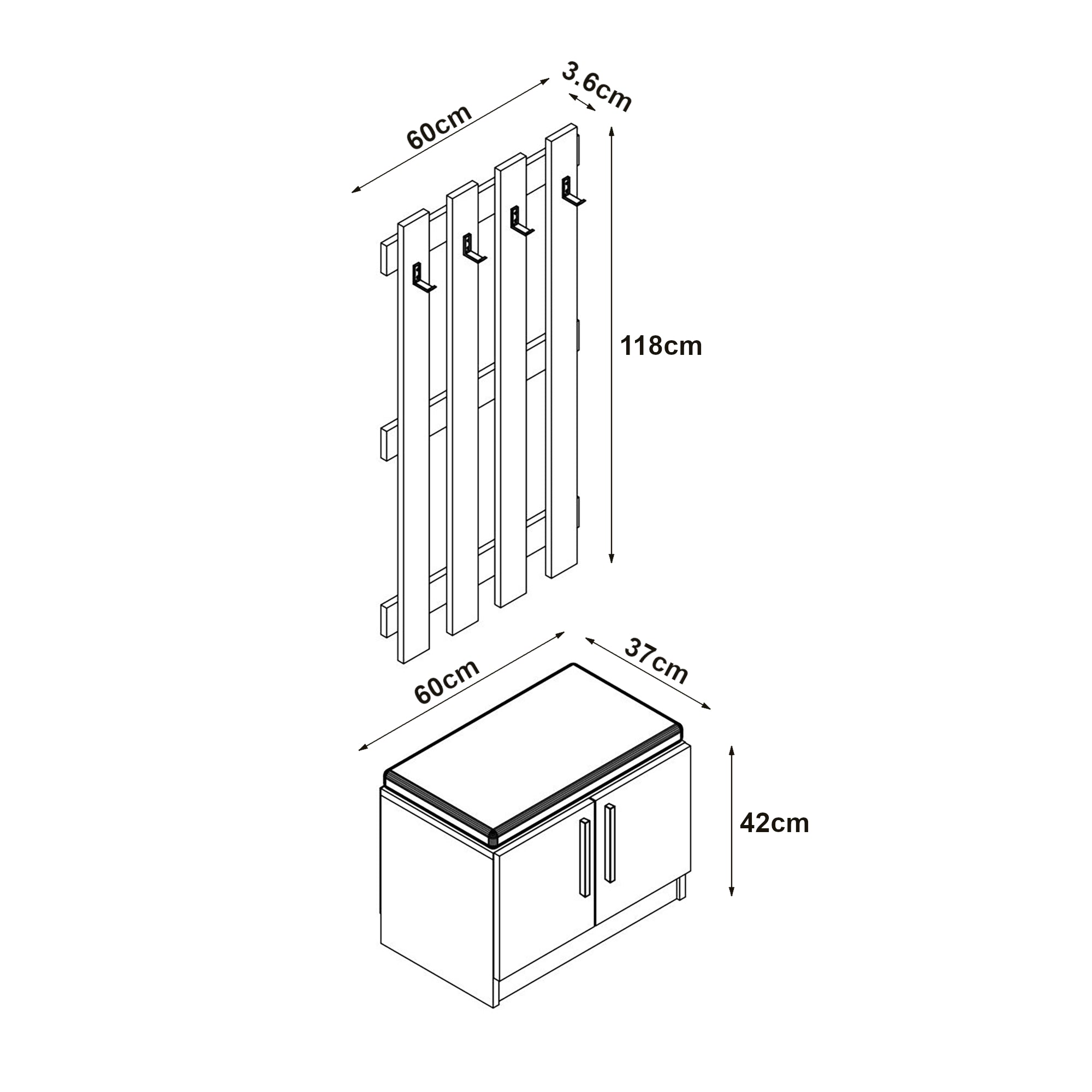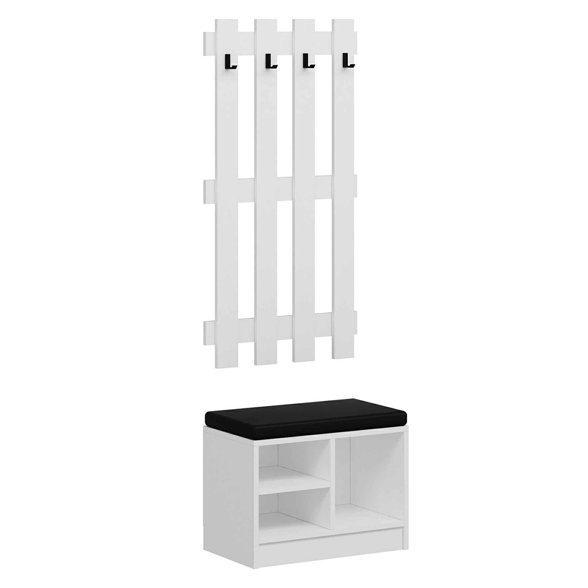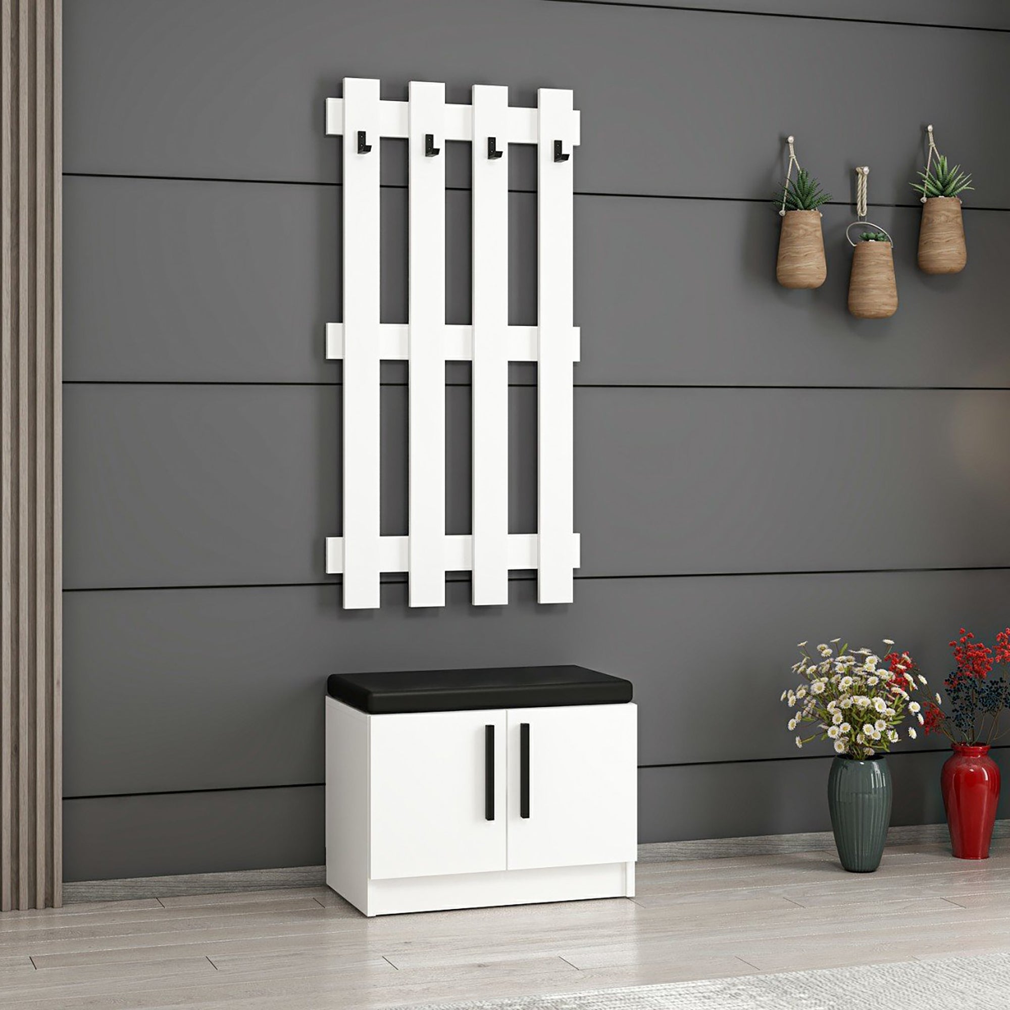 Le vestiaire mural avec 4 crochets à vêtements est parfait pour chaque entrée. Le banc à chaussures assorti dispose de 2 portes et offre l’espace de rangement idéal pour vos chaussures.