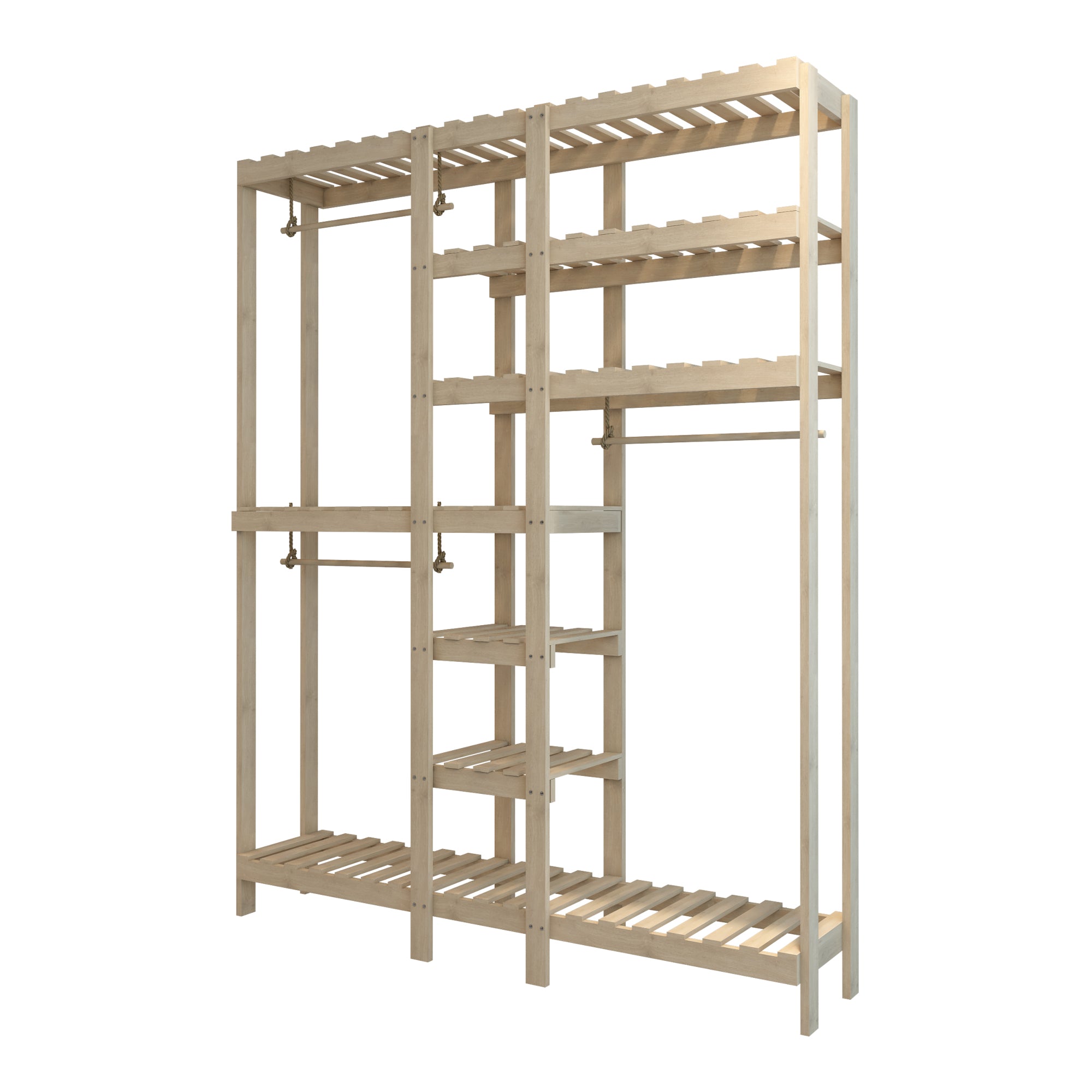 Le porte-vêtements pratique et stable en bois de pin naturel se monte rapidement et facilement. Il dispose de trois tringles à vêtements, six petits compartiments de rangement au centre pour les t-shirts ou les serviettes, et deux grands compartiments de rangement en haut à droite pour tous types d’objets. Les deux grandes surfaces de rangement inférieures conviennent par exemple parfaitement pour vos chaussures, tandis que la partie supérieure peut servir de rangement pour chapeaux.