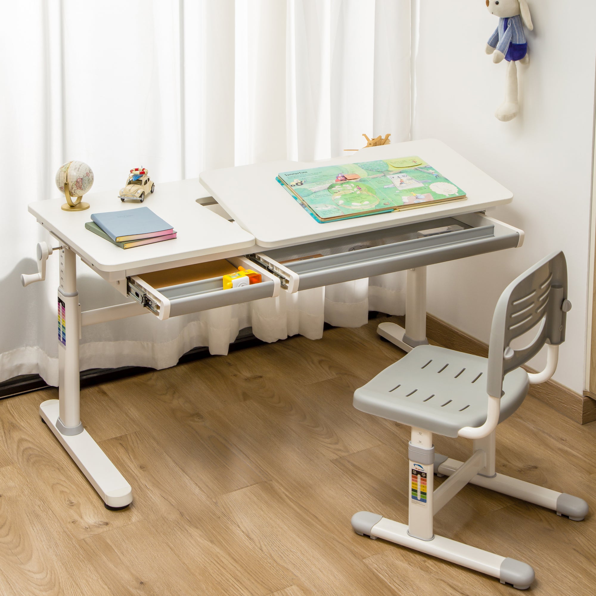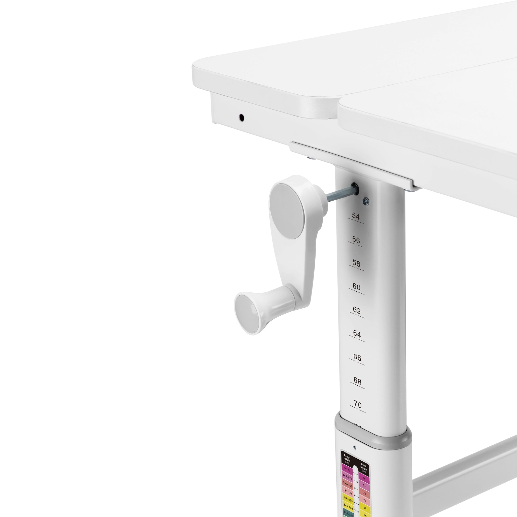 Notre bureau réglable s'adapte à la croissance et aux besoins de votre enfant et son design attrayant et sa fonctionnalité en font le choix idéal pour toute chambre d'enfant. La manivelle amovible permet de régler la hauteur pour une position assise ergonomique. Une partie du plateau de travail est inclinable de 0 à 50 degrés, favorisant une posture optimale pour lire, dessiner ou écrire. Deux tiroirs spacieux offrent un espace de rangement pour les fournitures scolaires, tandis que son crochet latéral permet de suspendre les sacs.