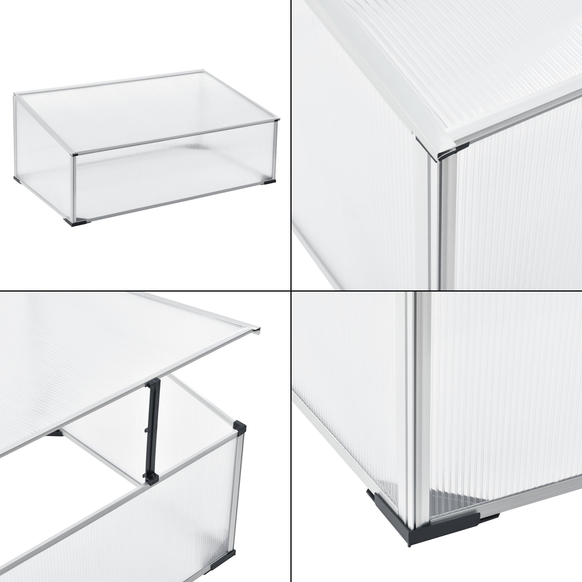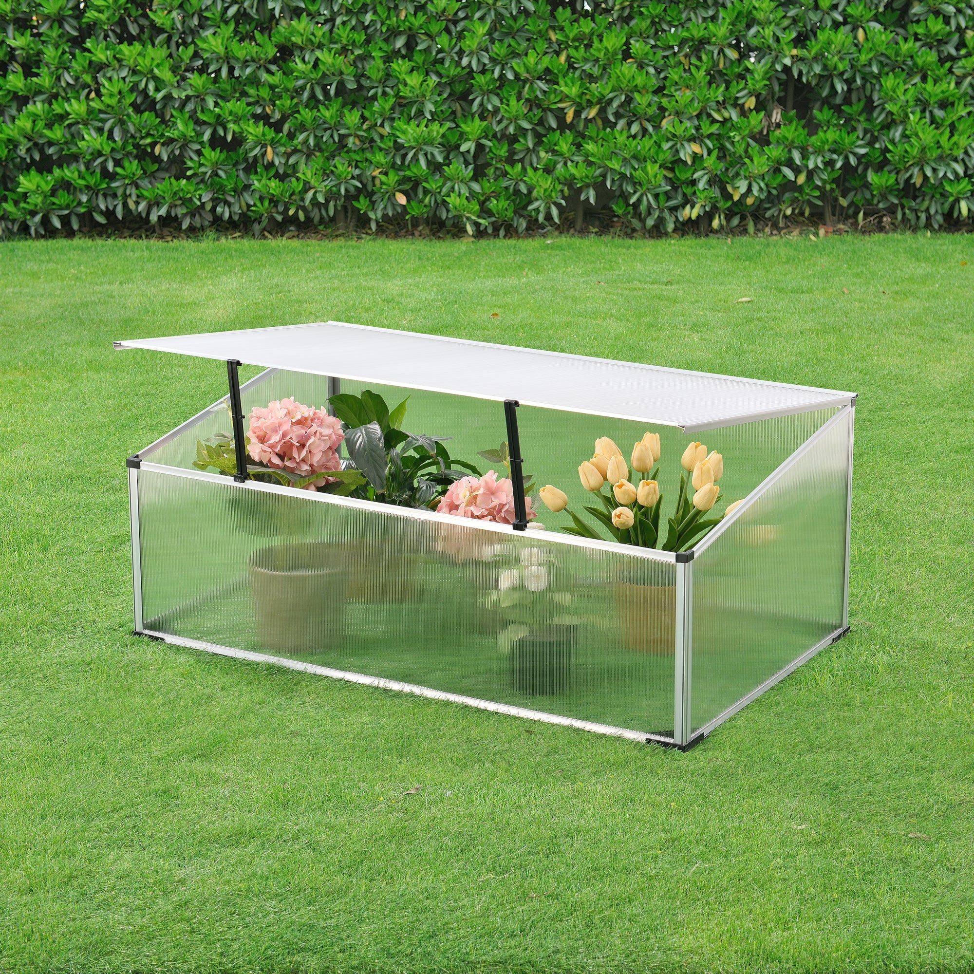 La mini-serre se monte et se démonte rapidement et facilement. Les plaques alvéolaires translucides assurent une lumière suffisante et le toit rabattable une bonne ventilation. De plus, le petit bac à plantes vous permet de faire pousser vos jeunes plants même pendant les mois froids et les protège en outre du vent et des intempéries.