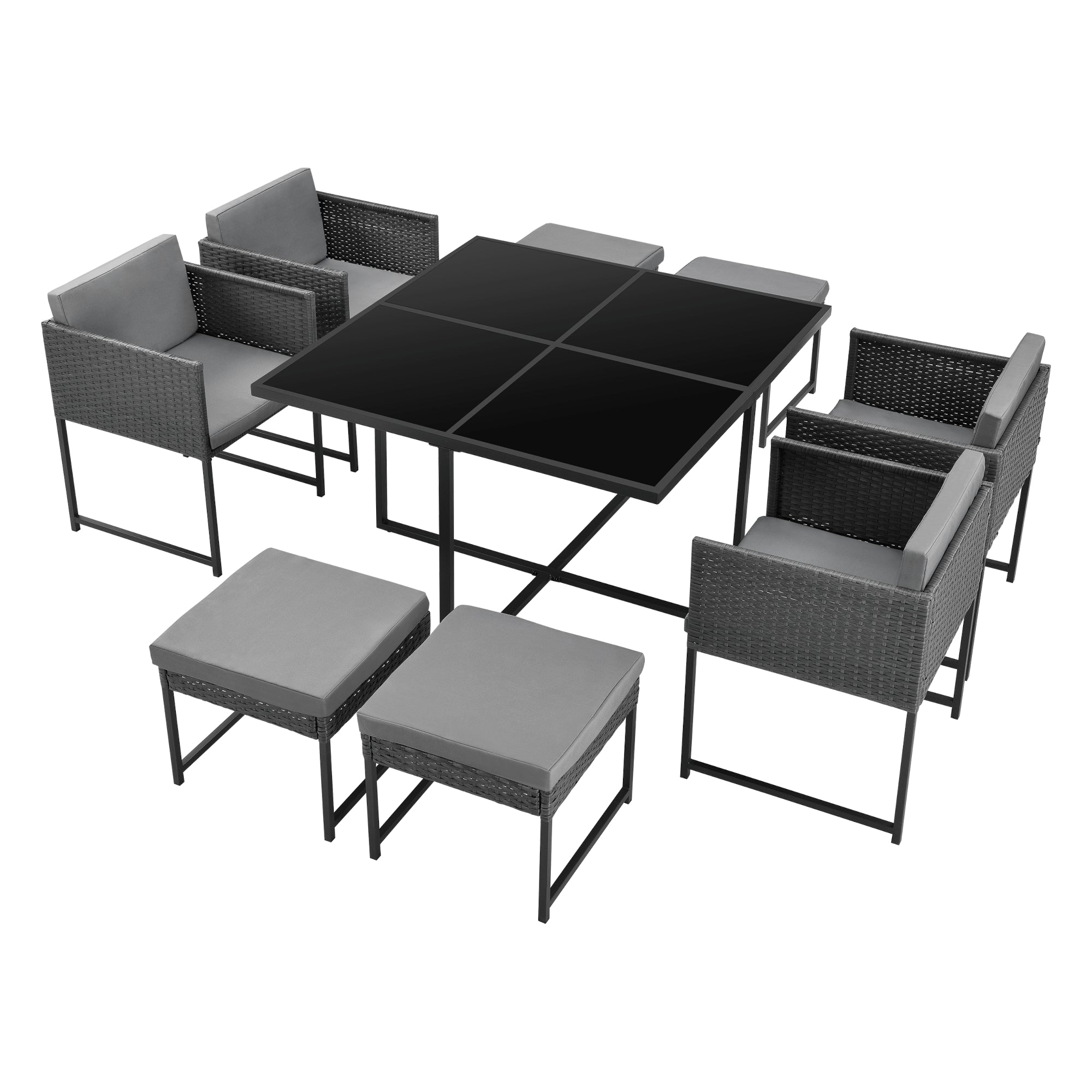 Ce mobilier de jardin esthétiquement attrayant se compose d'une table, de quatre chaises et de quatre tabourets. Il est idéal pour se détendre dans votre jardin, sur votre terrasse ou sur votre balcon. Les chaises et les tabourets peuvent être facilement regroupés et rangés de manière peu encombrante sous la table.