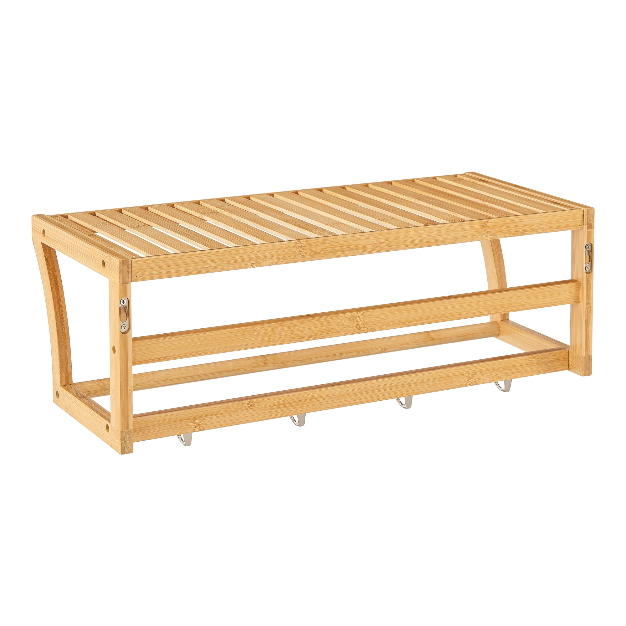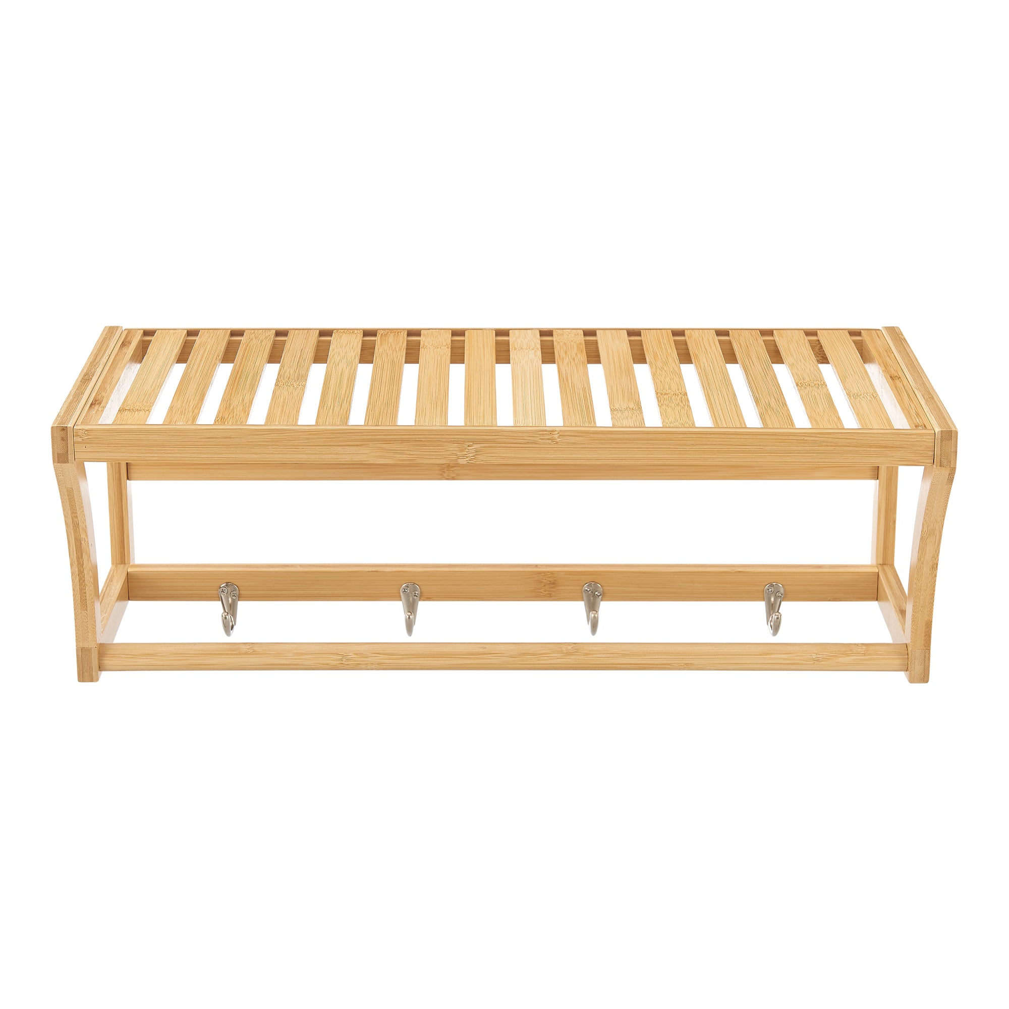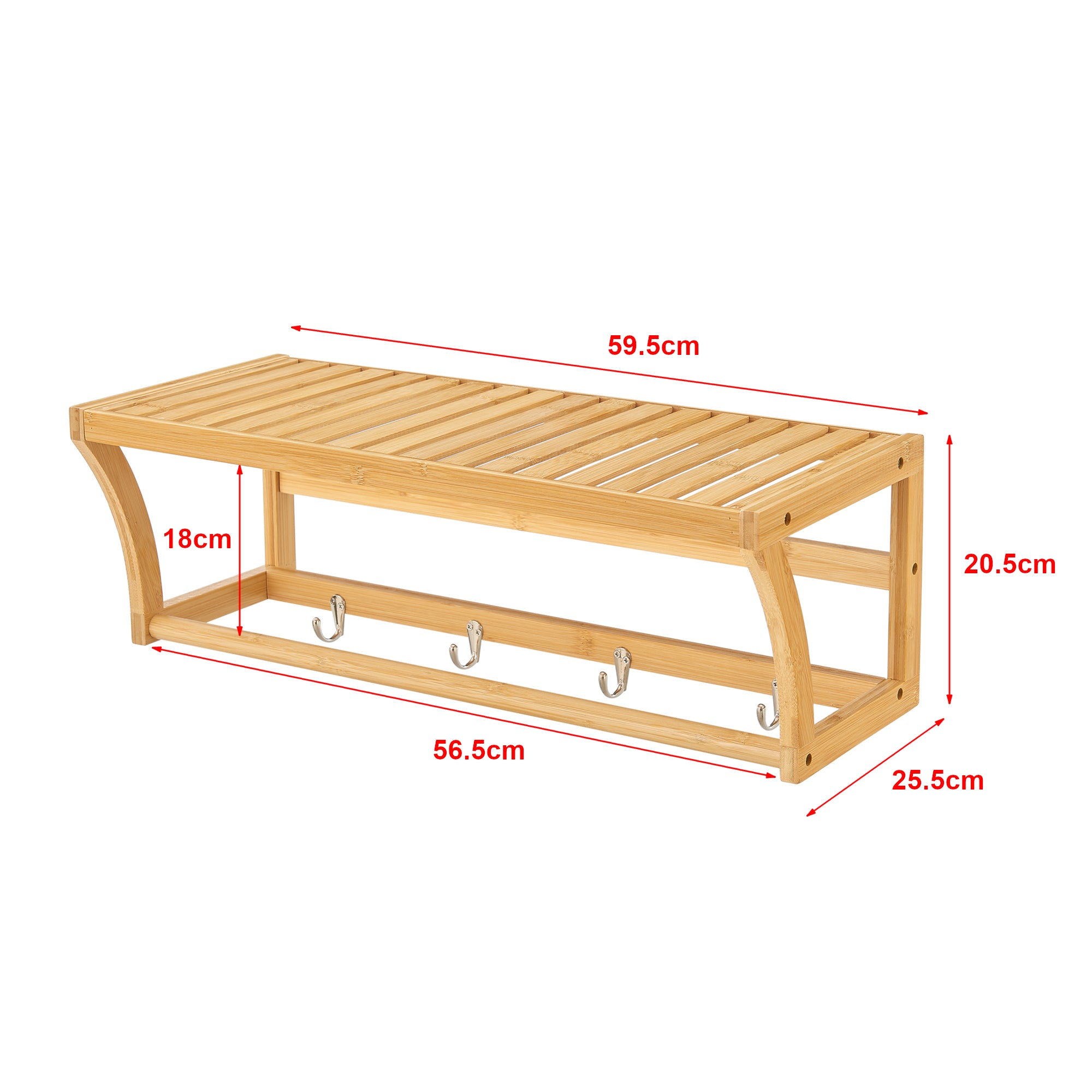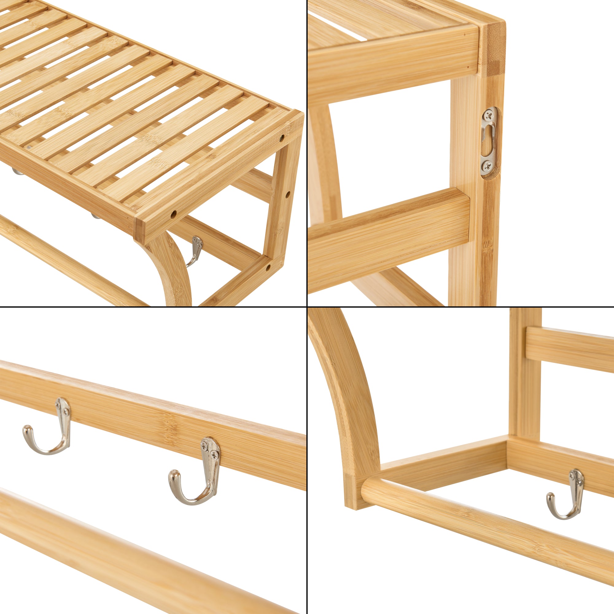 Notre étagère murale en bambou est la solution de rangement parfaite pour votre salle de bain, cuisine ou entrée. Son design attrayant s'intègre harmonieusement dans toutes les pièces de votre maison. Elle offre une étagère à lattes spacieuse pour ranger vos articles de salle de bain, objets de décoration et bien plus encore. De plus, elle est équipée de 4 crochets pratiques pour suspendre vos serviettes, peignoirs, vestes ou torchons. La barre de serviette intégrée vous permet de faire sécher vos serviettes facilement.