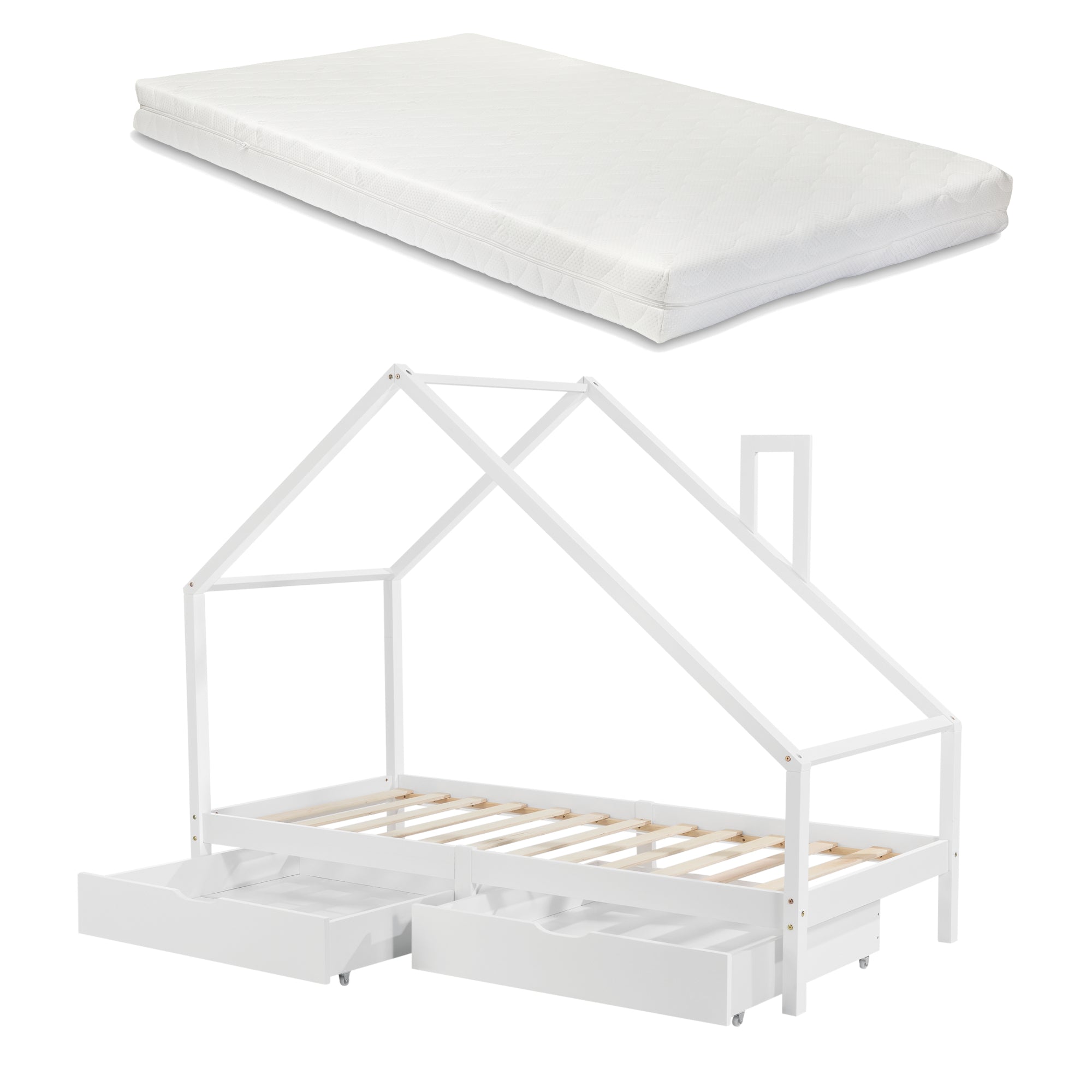 - Lit enfant en forme de maison avec espace de rangement grâce à 2 tiroirs