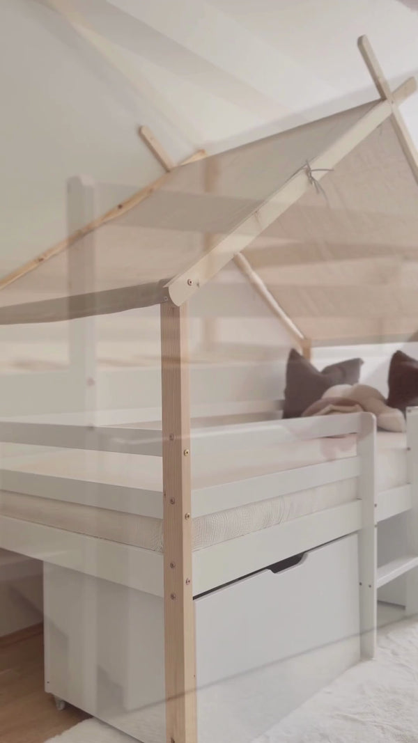 Ce lit en bois naturel crée un cocon chaleureux dans la chambre d’enfant grâce à sa forme de maisonnette. Le toit amovible à scratch, les deux tiroirs de rangement, l’échelle d’accès et la barrière de sécurité allient praticité et confort dans un design adapté à tous les styles.