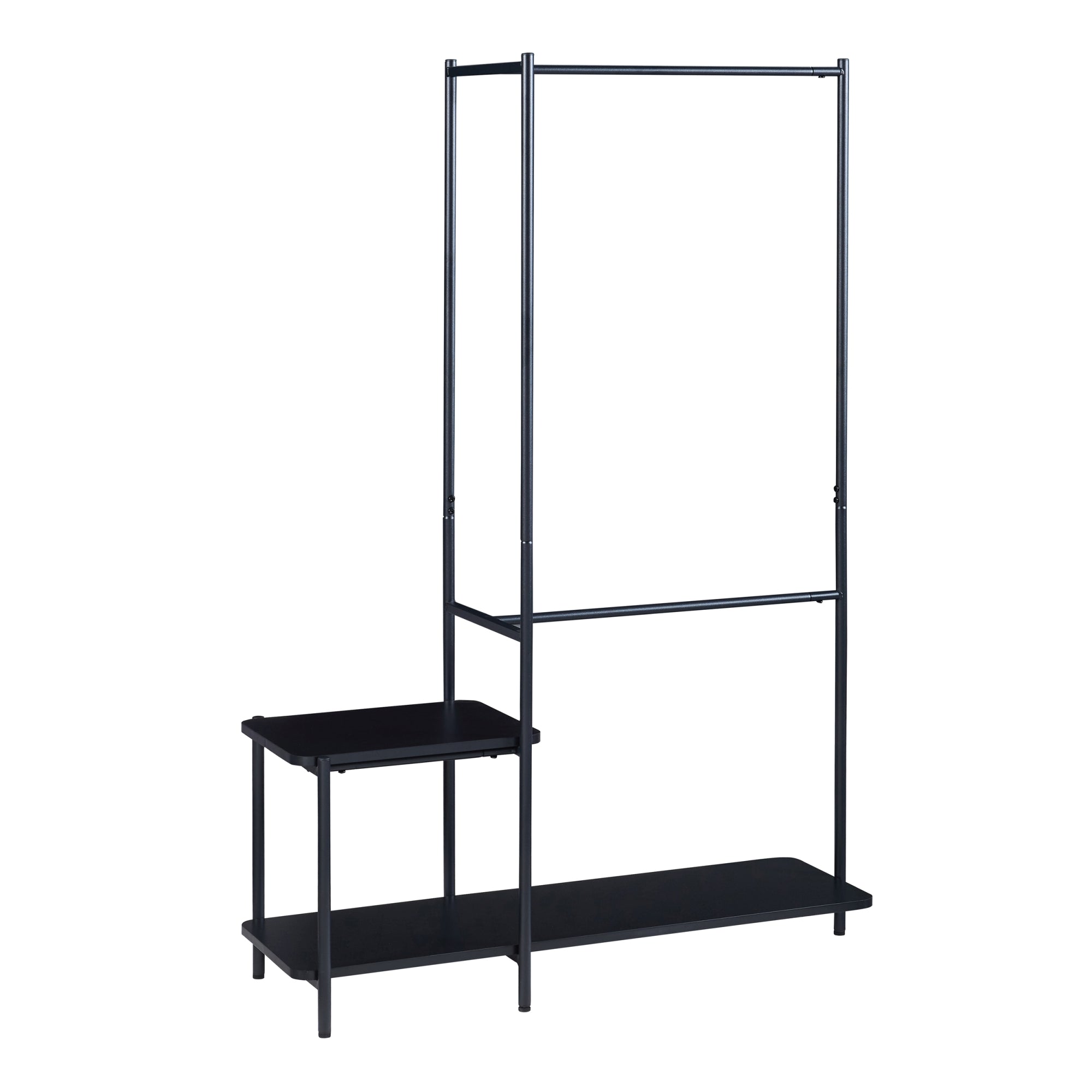 Ce portant à vêtements pratique et élégant se monte rapidement et facilement. Il est doté deux barres de penderie, une grande étagère en bas et une petite étagère latérale. Les barres de penderie offrent amplement d'espace pour les vestes, manteaux et robes. L'étagère inférieure ajoute un espace de rangement supplémentaire, idéal pour les couvertures et chaussures, tandis que le compartiment de rangement sur le côté est prévu pour les chapeaux et accessoires. Mettez de l'ordre dans votre entrée ou votre dressing avec ce portant polyvalent.