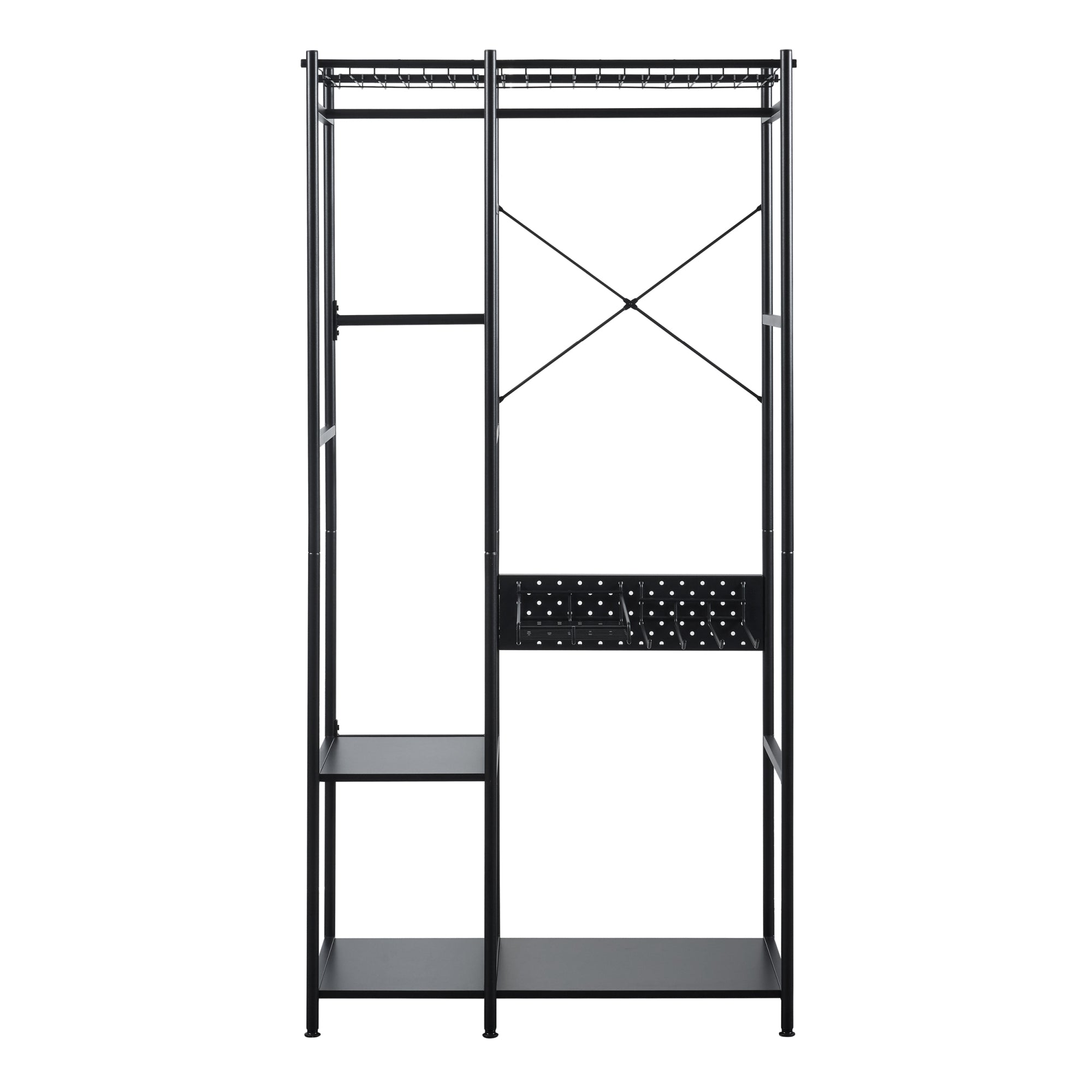 Le porte-vêtements pratique et élégant se monte rapidement et facilement. Il dispose d'une tringle à vêtements, d'une grande étagère supérieure, d'un rangement pour chaussures, d'un panier de rangement, de quatre crochets à vêtements et d'une étagère latérale.