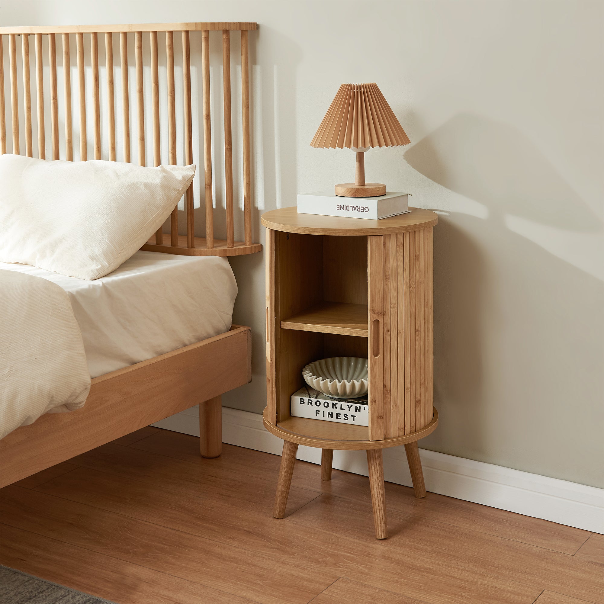 Le plateau robuste offre suffisamment d’espace pour une lampe, un smartphone ou un verre d’eau, tout en gardant vos essentiels à portée de main. À l’intérieur, deux compartiments permettent de ranger livre, lunettes ou chargeur de manière ordonnée.